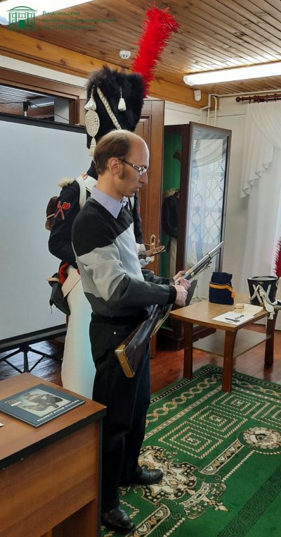 The book presents rare items from the museums of Belarus: weapons, uniforms and equipment, coins, awards. The author told the guests of the museum how he collected materials for his book, including in the funds of our museum. France has always been a trendsetter, and using the example of the dress uniform of a sapper of the Imperial Guard, Dmitry gave an idea of the French influence on the military uniform of the 19th century. The senior researcher of the Museum of the History of Medicine of Belarus Dmitry Laptsevich acted as a sapper of the Imperial Guard.