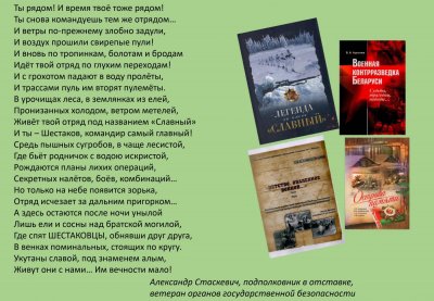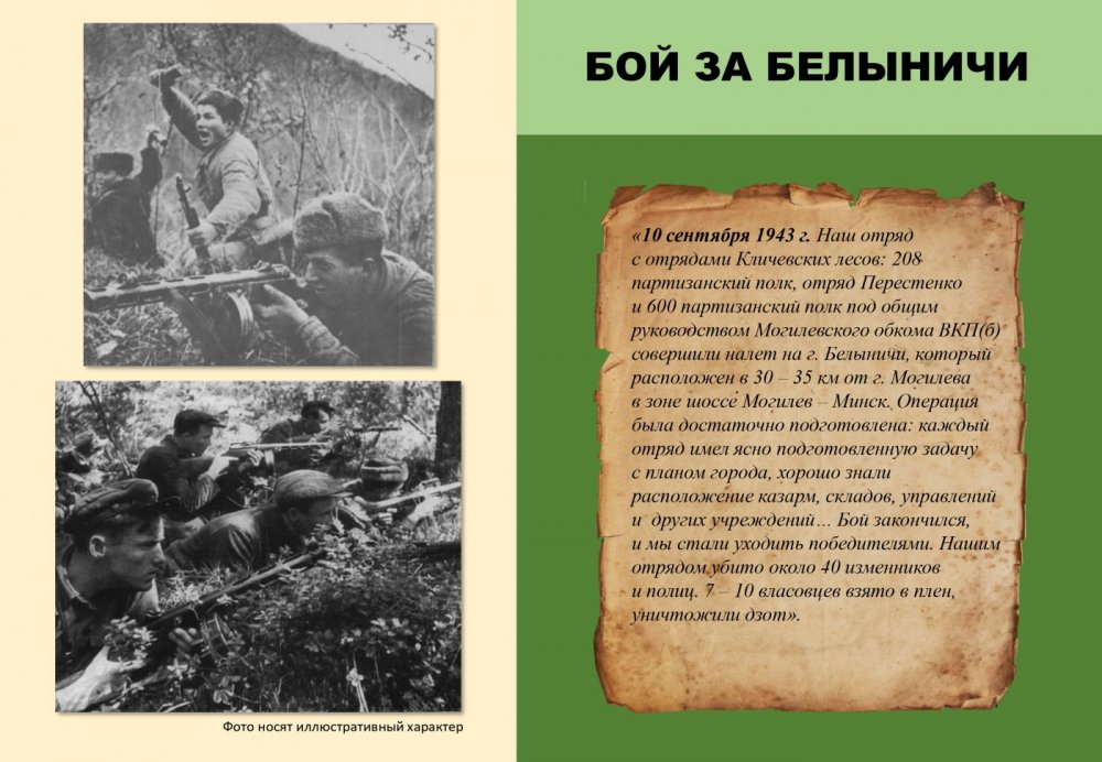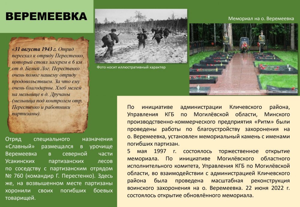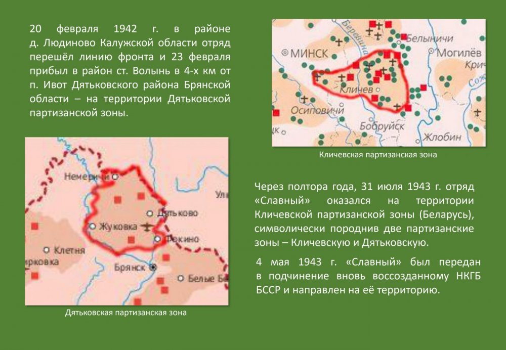 Предлагаем вашему вниманию виртуальную выставку «Славный путь «Славного», которая рассказывает о боевом пути отряда специального назначения НКГБ «Славный». В основе выставочного проекта лежит дневник начальника штаба Михаила Оборотова. Во время Великой Отечественной войны отряд почти два с половиной года действовал в глубоком тылу врага, с боями пройдя 1500 километров. 15 месяцев отряд находился в Брянской области, остальные 15 месяцев – на территории Беларуси. 8 месяцев «Славный» базировался на территории Кличевской партизанской зоны и провёл множество боевых операций совместно с кличевкими партизанами.